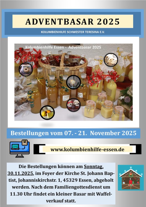 Bitte holen Sie Ihre Bestellungen am Sonntag, 08. Dezember 2024, ab 11.30 Uhr, im Foyer der Kirche St. Johann Baptist, Johanniskirchstr. 1 in 45329 Essen, ab.