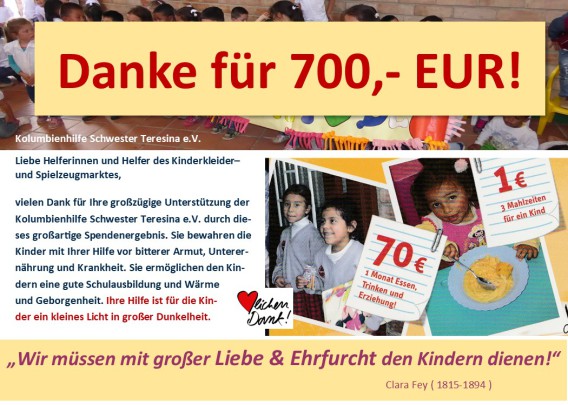 vielen Dank für ihre großzügige Unterstützung der Kolumbienhilfe Schwester Teresina e.V. durch die Einnahmen des Spielplatzfestes.