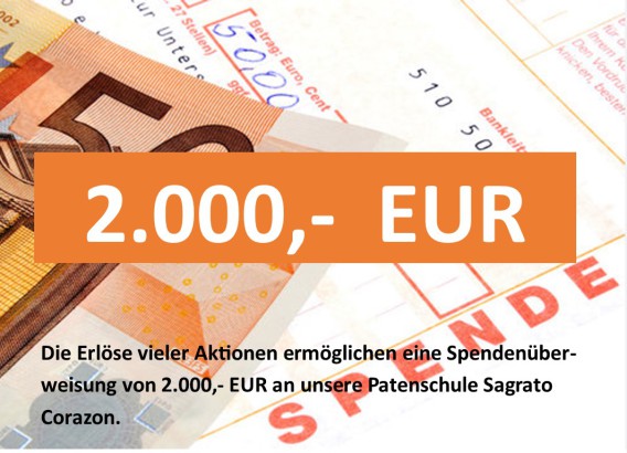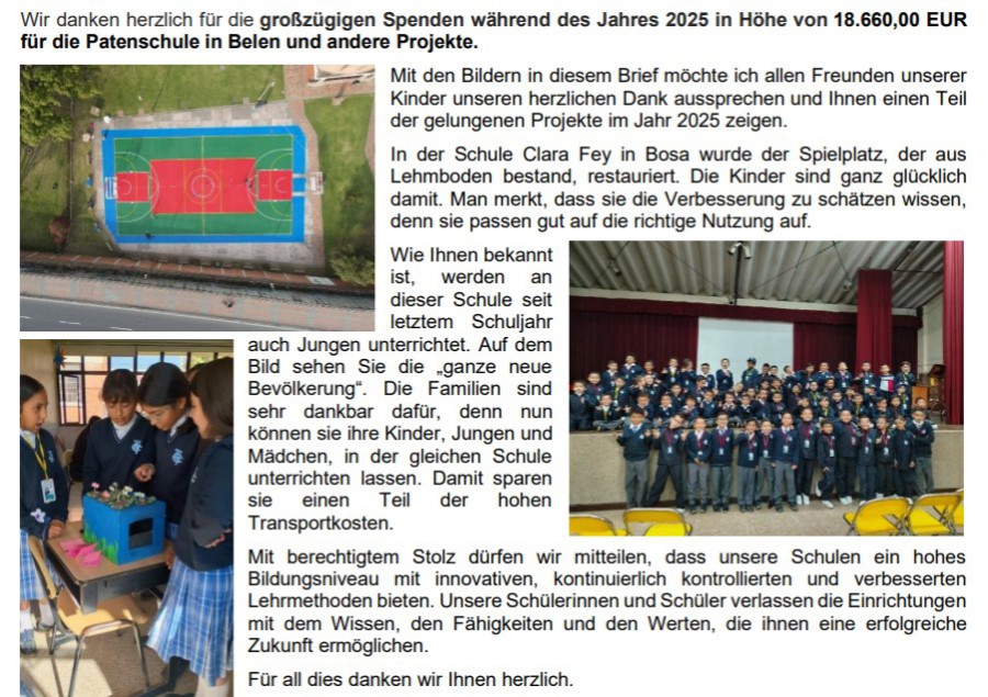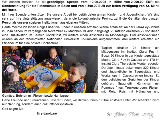 Die Schwestern vom armen Kinde Jesu bedanken sich für die Spendenüberweisung in Höhe von 1.000,- EUR für die Patenschule in Belen und für 2.000,- EUR zur freien Verfügung von Schwester Maria del Rocio
